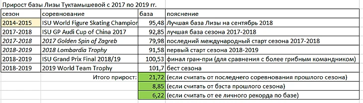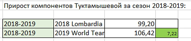 Если же вести отсчет роста компонентов за прошлый сезон с Лизиного компонентного бэста на тот момент (в начале сезона 17-18, на Finlandia Trophy она получила 97,39), то прирост компонентов Лизы составит 9,03 балла.