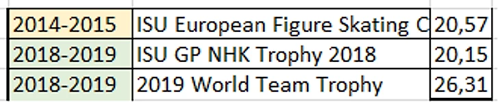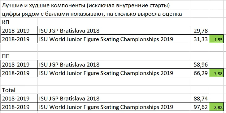 Надеюсь, цифры видно. разноцветные столбики рядом с каждой оценкой - это на сколько повысилась или упала оценка по сравнению с предыдущим международным стартом.