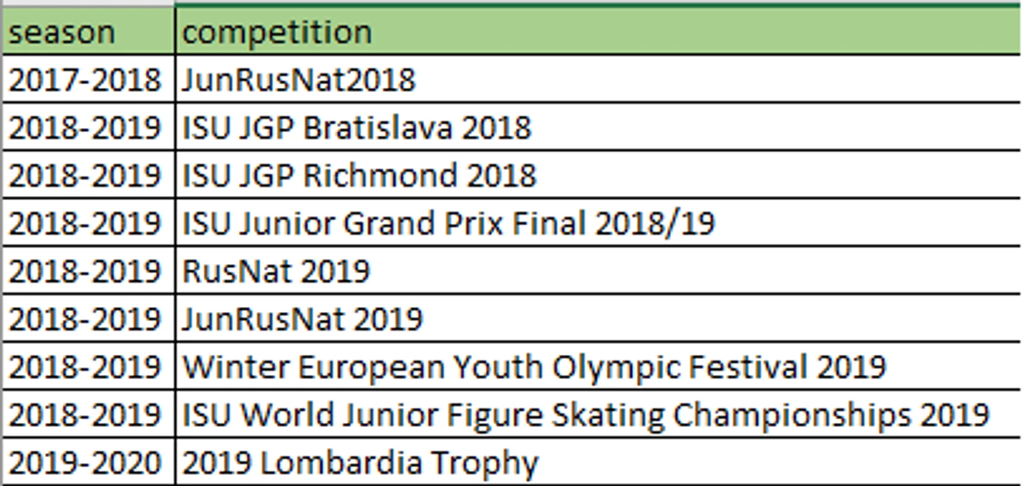 Международные старты: этапы юниорского гран-при, финал, чемпионат мира, юношеская олимпиада, взрослая бэшка.