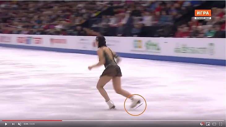 Иногда ей удается исполнить его с плоского ребра (знак "!") которое подразумевает штрафы, но незначительные. Однако первый лутц в ПП на SA был с неверного, а второй просто невозможно рассмотреть в момент отрыва из-за ракурса съёмки.