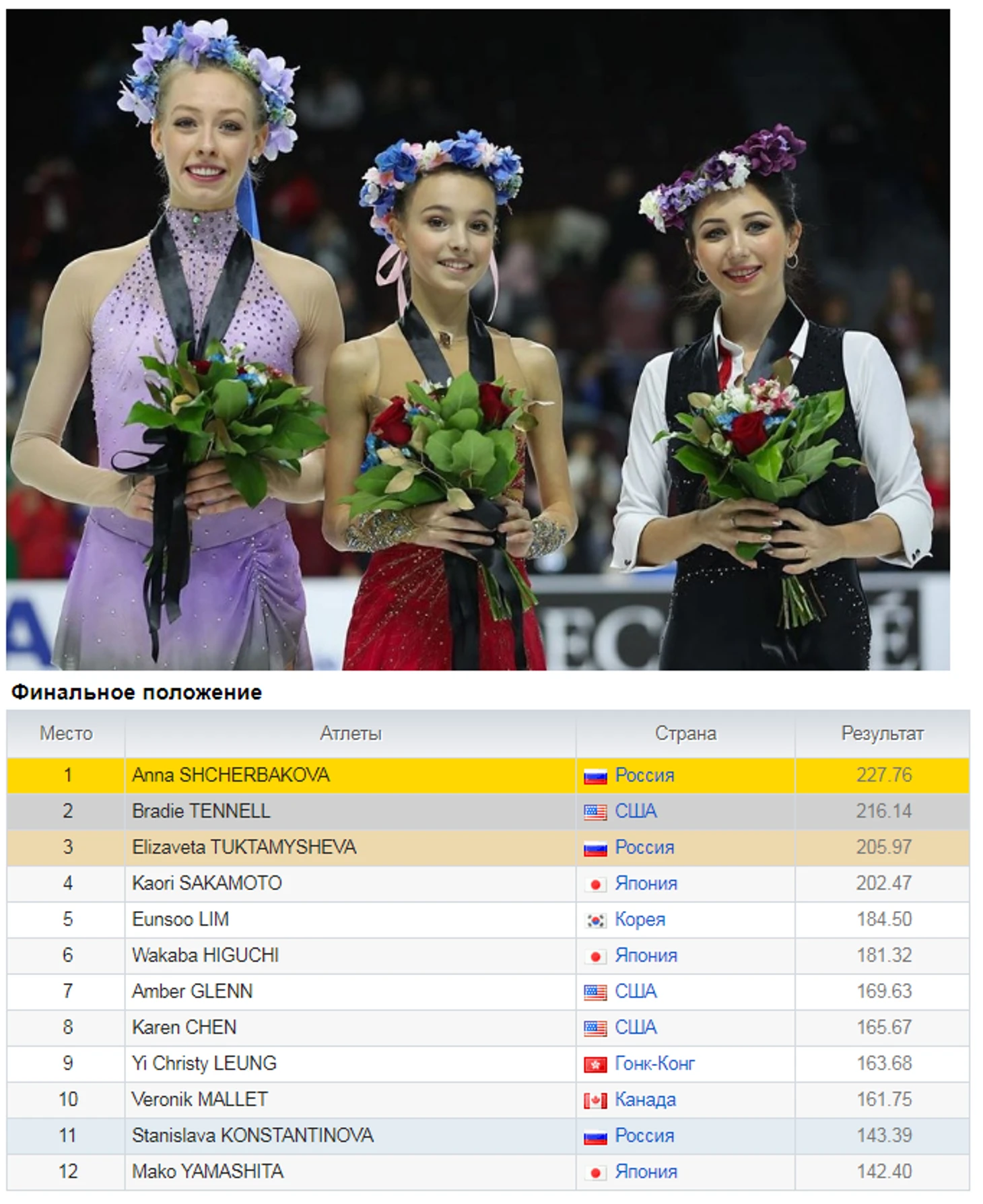 Брэйди Теннел прослыла победительницей КП, чем обеспечила себе попадание на пьедестал. Надеюсь, что когда-нибудь перестанет действовать правило "домашних оценок". В Сайтаме в марте, например, всё было более менее корректно, потому что своих там не жалели. Протоколы КП для сравнения: