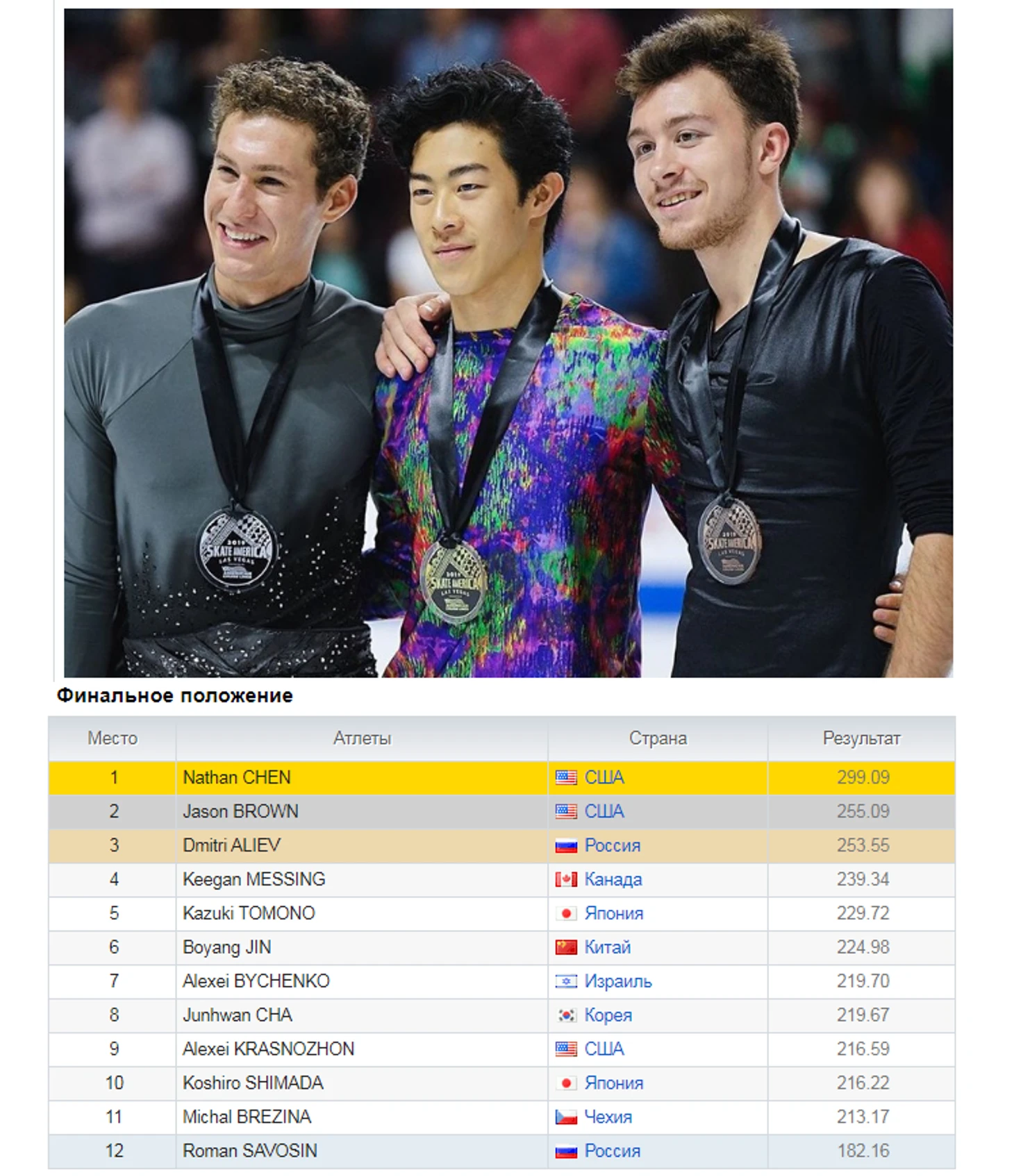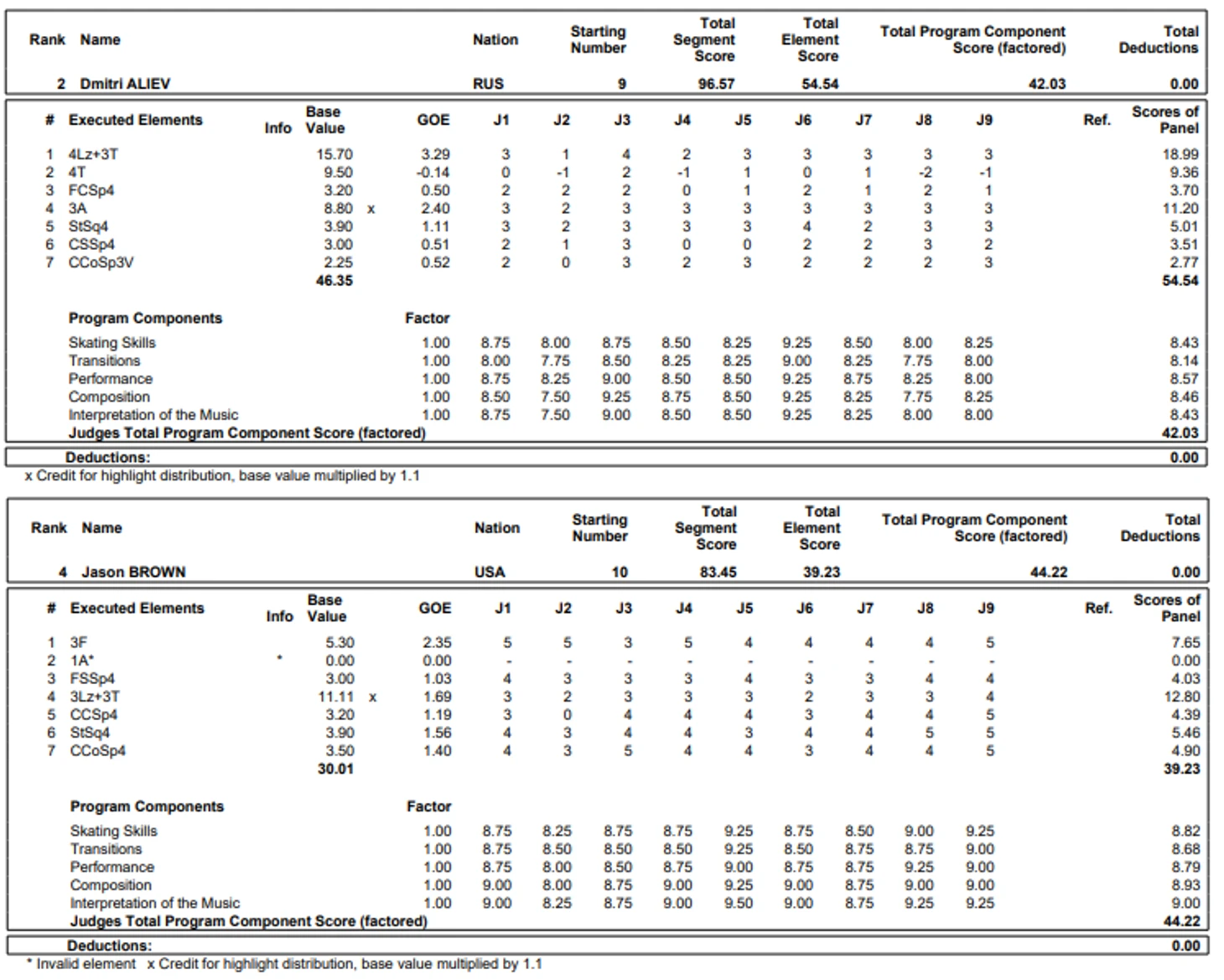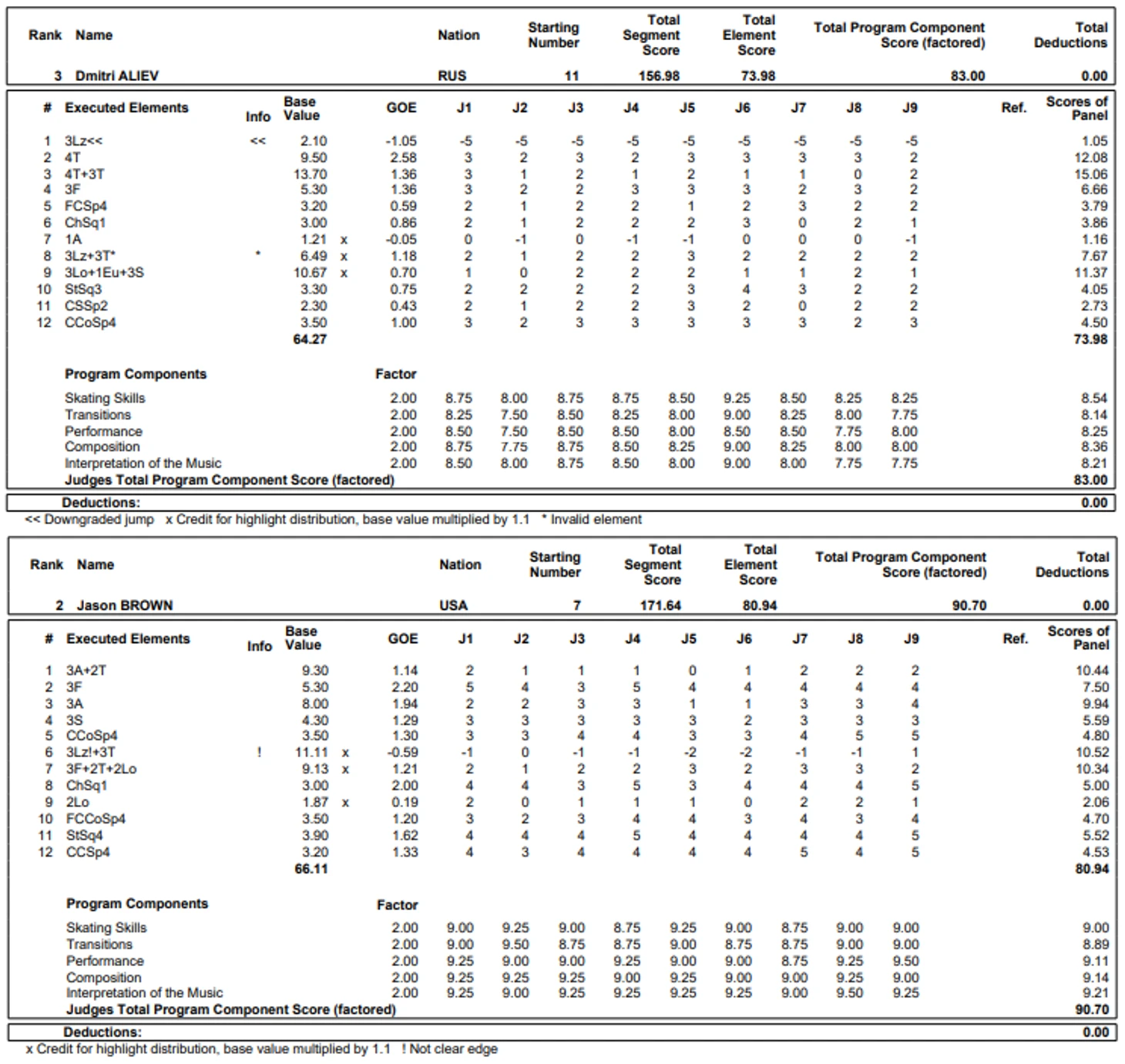 Вторыми на лёд выходили представители мужского одиночного катания. Дебют Романа Савосина был не очень удачным и он, увы, закончил соревнования с результатом 186,16 балла на последнем месте. Не сдавайся, Рома, твоя КП всё ещё будоражит моё сердечко как обожателя ансамбля Моисеева. Дмитрий Алиев был в отличной форме и показал шикарный прокат КП за исключением помарки на выезде с сольного четверного тулупа, которую в аналогичном случае с Ченом не стали минусовать, а даже прибавили немножко. После короткой программы Дима занимал вторую строчку и имел преимущество над Джейсоном Брауном в 13 с небольшим баллов. Но в итоге Браун, конечно же, заскочил на второе итоговое место, без четверных. Я абсолютно согласна с возмущениями Алексея Ягудина во время КП. Ведь судьи продолжают поощрять его простенькие программы, насыщенные дорожками и вращениями. Тогда где же спорт? Ниже представлены протоколы КП и ПП Дима и Джейсона, просто сравните.