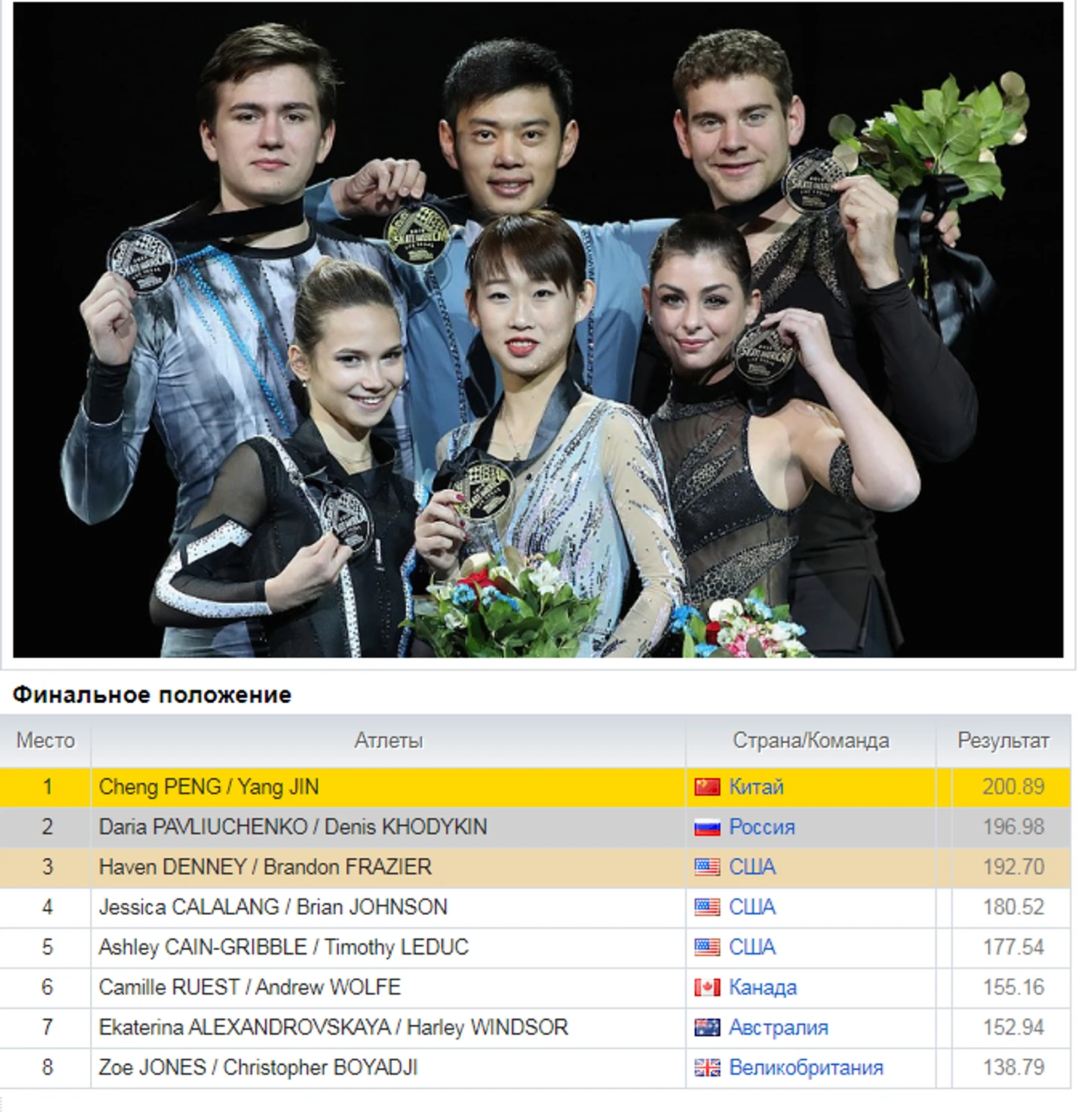 Первыми свои выступления начинали пары. Наши ребята Дарья Павлюченко и Денис Ходыкин шикарно откатали свою КП и получили достойные баллы. Проигрывали они лишь китайцам Чэн Пэн и Ян Цзинь чуть меньше полутора баллов. В произвольной программе ребята допустили очень обидную ошибку на первом выбросе, за что были, конечно, наказаны. Но для меня всё же странно такое преимущество китайцев в произвольной, где они допустили много ошибок. Грустно, очень грустно. Наши ребята заняли итоговое второе место с результатом 196,98 балла. И у них есть отличные шансы пробиться в ФГП, за что и будем держать кулачки.