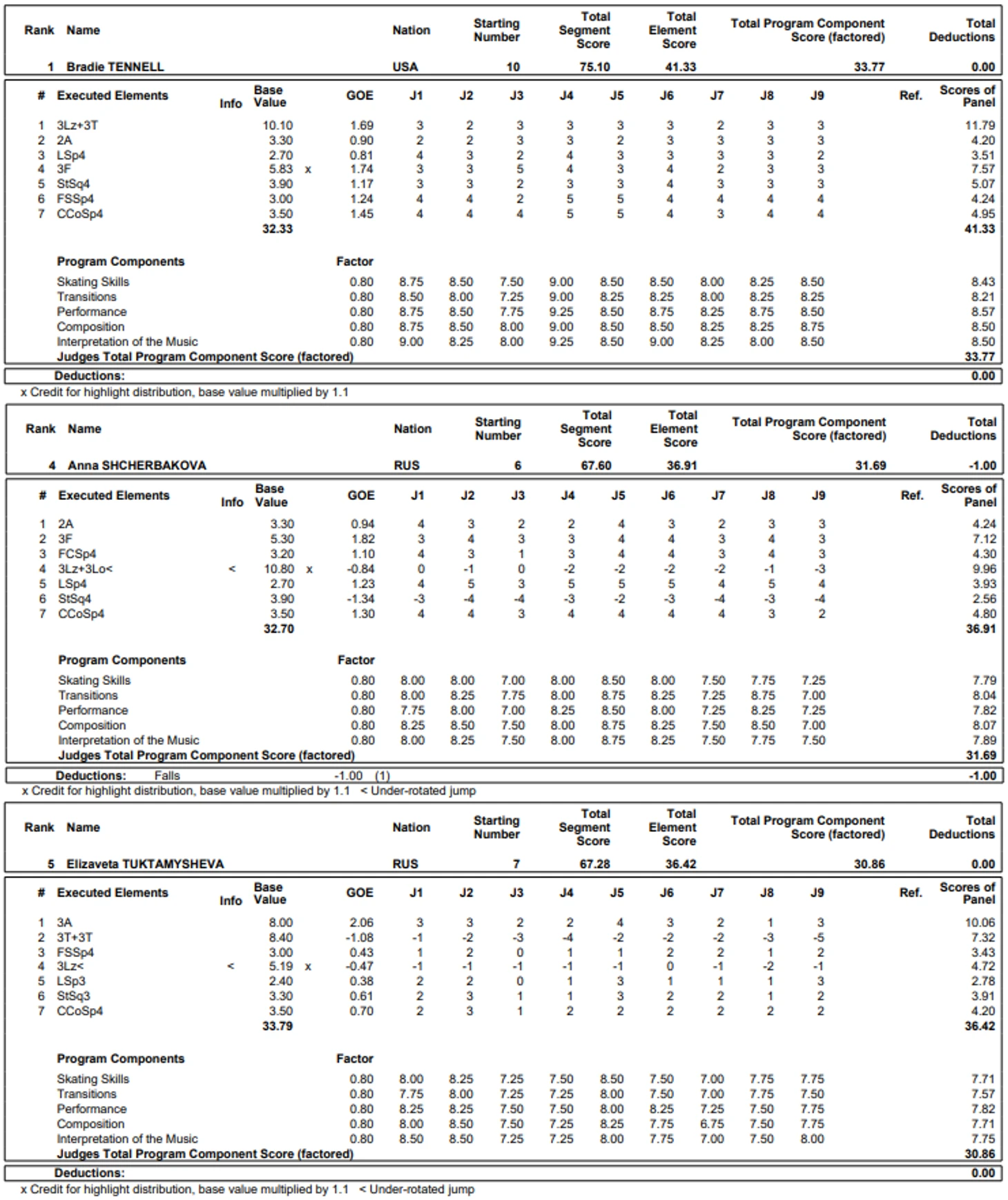 Каори Сакамото, владеющая коньком на голову выше Брэйди, получила чуточку больше за компоненты, но зато намного меньше GOE. Проехали.