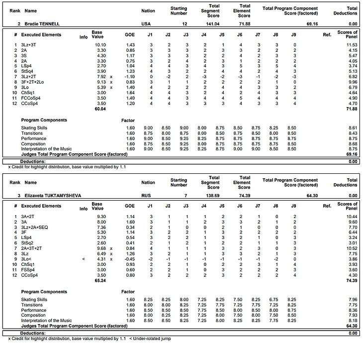 Одна лишь просьба, Лиза, дорогая, сделай что-нибудь с вращениями, ты ведь настоящий профессионал. Триксели отшлифованы, пора браться за всё остальное. И спасибо тебе за борьбу. Не знаю, сколько ещё продолжится понижение компонентов Лизы. Понимаю, что одни аксели - не оружие, но ведь все мы знаем и такого рода случай, когда высоченные компоненты были получены за разобранную ПП, пусть и на коммерческом старте. Где справедливость? Елизавета Туктамышева закончила соренования на обидном 3-м месте с результатом 205,97 балла. Ладно, сравним Лизу снова с Брэйди.