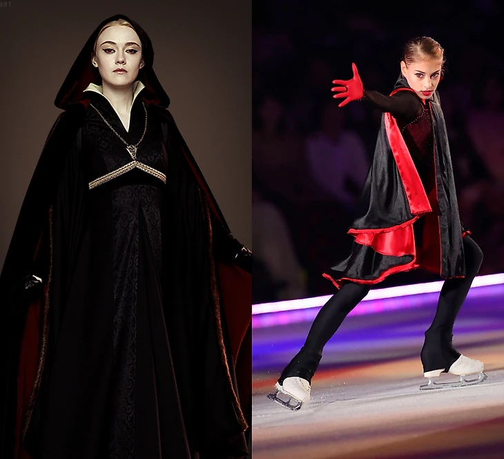 Программа эта, как известно, выросла из показательного номера, который Алёна впервые представила в конце прошлого года на шоу Этери Тутберидзе «Чемпионы на льду». Даниил Глейхенгауз не в первый раз ставит такие удачные шоу-постановки, что их превращают в соревновательные программы: та же судьба была у «Анны Карениной», поставленной в олимпийский сезон для Евгении Медведевой. Алёна отмечала, что изображает роль главной героини «сумеречной саги» Беллы Свон, хотя мне лично в концертном макияже и костюме она больше напоминала вот эту барышню из фильмов: