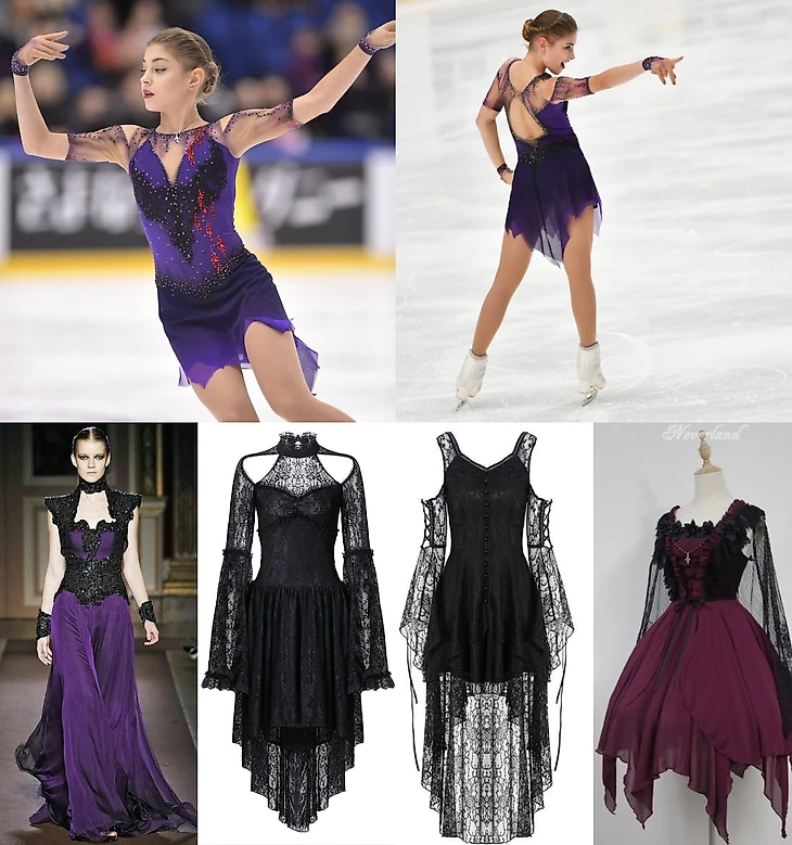 Платье для этой программы никак не отсылает к нарядам героини из фильмов (что, по-моему, хорошо так одежда у ней в 80% случаев так себе), но хорошо подходит ко всем трём музыкальным отрывкам. После премьер платьев-трансформеров Анны Щербаковой и Александры Трусовой многие ожидали, что костюм Алёны тоже будет «с сюрпризом», однако ТШ не стал повторяться трижды. С концертным красно-чёрным образом новый наряд тоже ничего общего не имеет (кроме, пожалуй, открытой спины). Дизайнер (судя по всему, это была Ольга Рябенко) придумала платье в готическом стиле с открытыми плечами, чёрной кружевной отделкой на лифе, «рваной» юбкой и недвусмысленным намёком на «вампиризм» в виде капель крови. Чаще всего в одежде этого стиля используется чёрный цвет, но нередко встречаются и сочетания чёрного с насыщенными оттенками фиолетового, лилового.