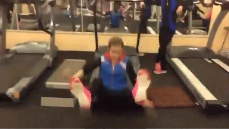 14.11.2015. Алина и Новахова Ева. Тренажерный зал. Алина подзуживает Еву прокатиться на беговой дорожке, включенной на высокую скорость.