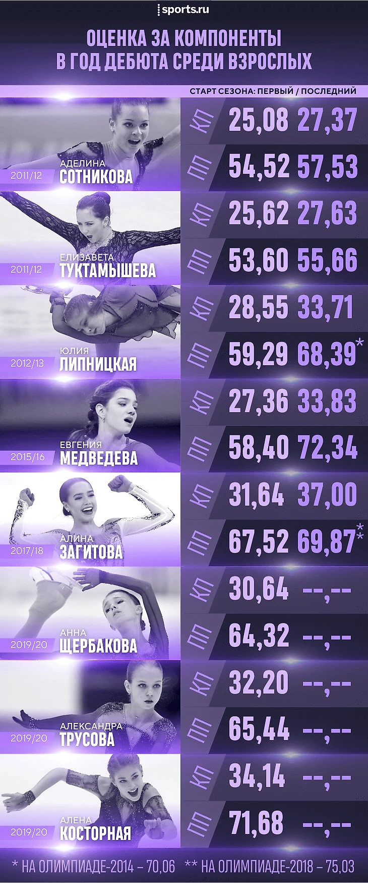 Саша Трусова за дебютную произвольную на мемориале Непелы получила компоненты на 5 баллов больше, чем Липницкая за первый прокат «Списка Шиндлера» – у девочки в красном платье не было квадов и каскада лутц-риттбергер.
