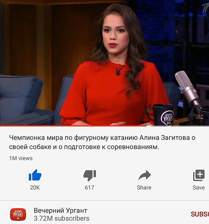 Выпуск программы «Вечерний Ургант» с участием Алины Загитовой и Масару с 12.04.2019г на сегодня (08.11.2019г) набрал более 1,011 млн. просмотров!