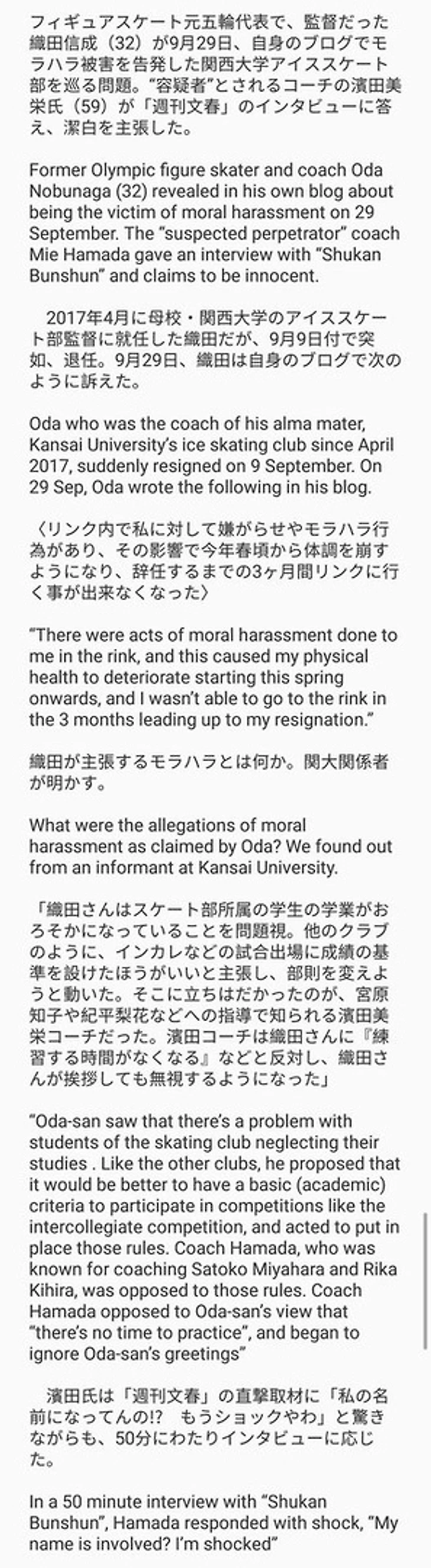 Сегодня появилась внезапная новость: Нобунари Ода (в прошлом известный японский фигурист, чемпион 4 континентов в 2006 году, трехкратный призер финала Гран-При и пятикратный победитель - этапов, лучший результат на чемпионате мира - 4е место в 2006, на Олимпиаде в Ванкувере он занял 7е место) подал иск на Мие Хамаду, обвинив ее в харассменте.