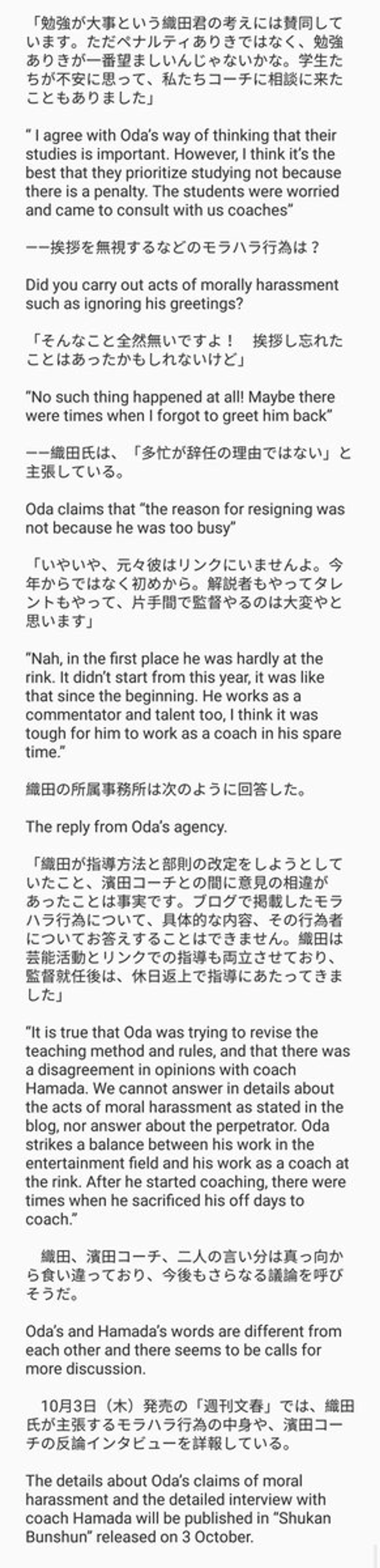 Однако, 29 сентября сам Ода сделал запись на эту тему в своем блоге. В ней он сообщил, что на самом деле причина того, что он покинул каток Кансая, другая - и связана она с моральным харассментом, который наряду с психологическим подорвал и его физическое здоровье.
