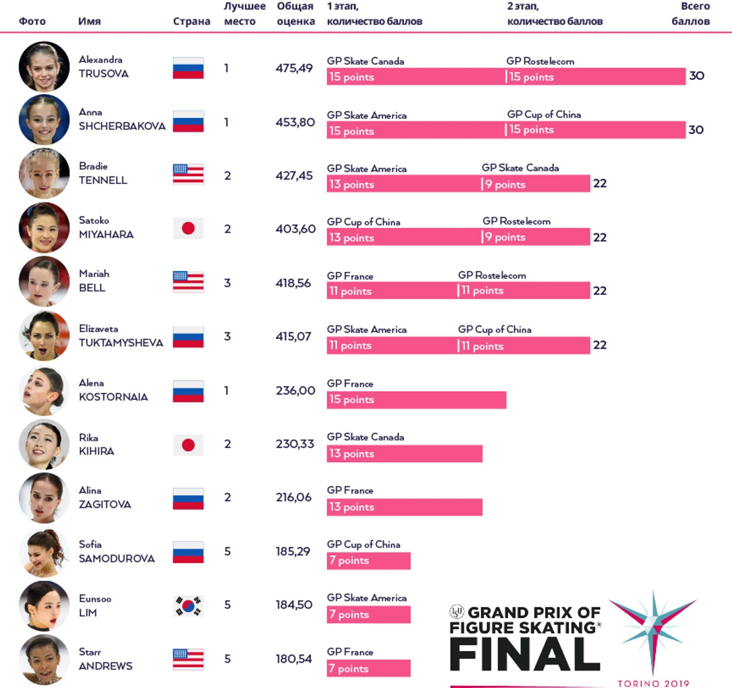 Общий зачет суммы баллов наиболее вероятных претендентов на прохождение в Финал Гран-при выглядит следующим образом: