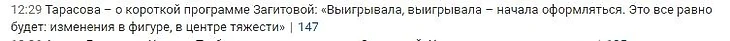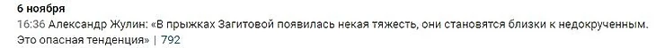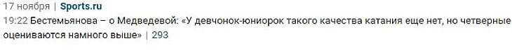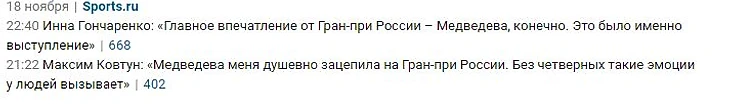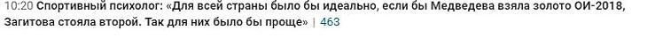Привожу примеры заголовков статей которые в прошлом сезоне неоднократно появлялись на всех ресурсах, сейчас это также продолжается, но, Слава Богу, уже не так открыто. Перед этим конечно же хочется сказать: Алина никому ничего не должна. Меня всегда поражало то, что серебро на ЧЕ - назвали проигрышем, серебро на этапе ГП раскритиковали в пух и в прах, и при этом там Загитова уступила очень достойной сопернице, так в чем проблема? И эти же люди называют откровенные провалы одной фигуристки "нормальными, ведь она привыкает, меняется". А если программу удается откатать чисто - то все, пир. "С возвращением, золотые медали будут только у тебя!". Под таким давлением ни то что 17-летняя девушка будет чувствовать себя неуверенно, тут и о взрослом, обычном человеке, можно даже не говорить. Особенно пугает что на спортсе негативных комментариев в сторону Олимпийской Чемпионки становится больше, а негативные посты о ней попадают на главную. Люди, что с вами? Тоже самое творилось когда у Алины было День Рождения. Негативные посты висели на главной, а хорошие, с пожеланиями - максимум 2. Зато когда у другой фигуристки было День Рождения - оды пелись несколько дней.