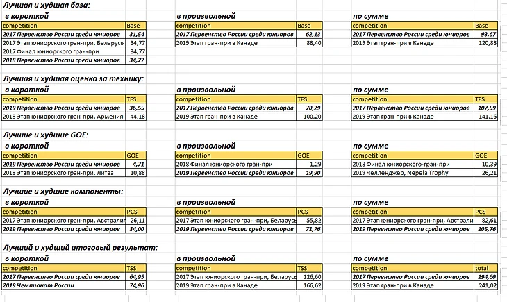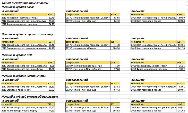 Для тех, кто раньше посты не видел: в этой серии я анализирую исключительно протоколы, собираю статистику по фигуристам, ориентируясь на официальные цифры, а не на фанатские спекуляции был недокрут/не был недокрут. Ранее в блоге уже были посты про Лизу Туктамышеву и Аню Щербакову, можно посмотреть и почитать.