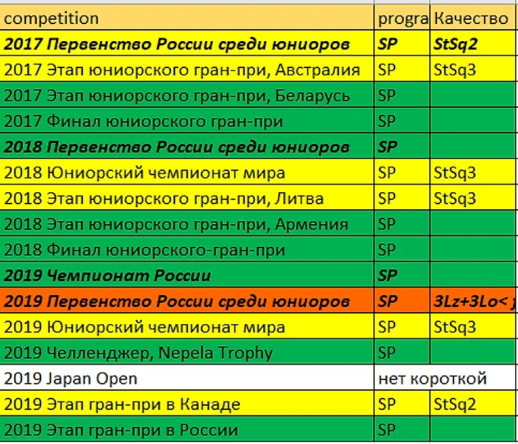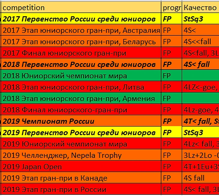 Напомню, что зеленым цветом я отмечаю идеально выполненные программы, с плюсовыми ГОЕ и всеми непрыжковыми четвертого уровня. Желтым - визуально чистые прокаты, в которых все элементы выполнены на плюсы, но слетели уровни одного или нескольких непрыжковых. Оранжевым - прокаты, в которых только один элемент выполнен с ошибкой (с отрицательным значение GOE) и красным - грязный прокат, в котором два и больше элементов оценены на минусы.