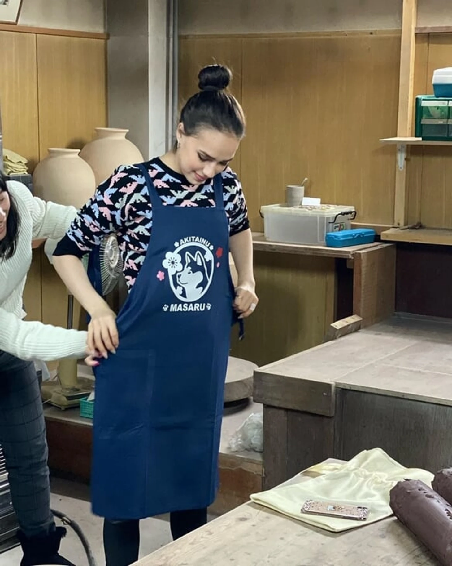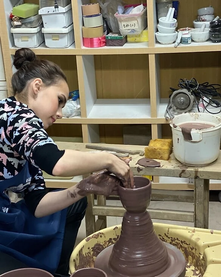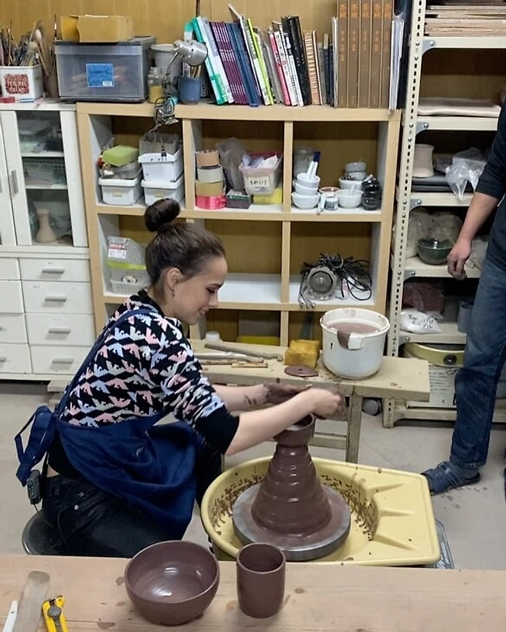 От реплики до реализации пролетело несколько дней: Алина вместе с хореографом Даниилом Глейхенгаузом посетила мастерскую и поработала за гончарным станком.