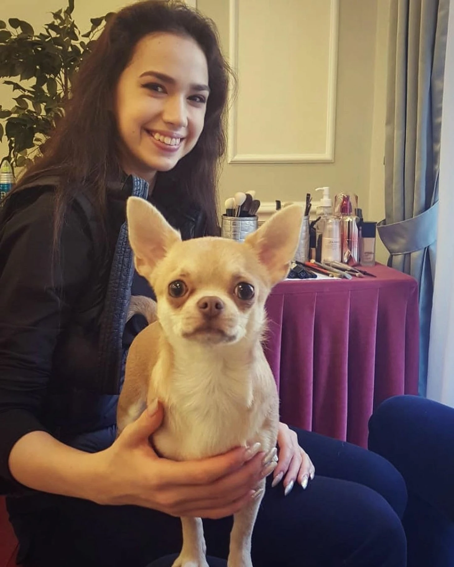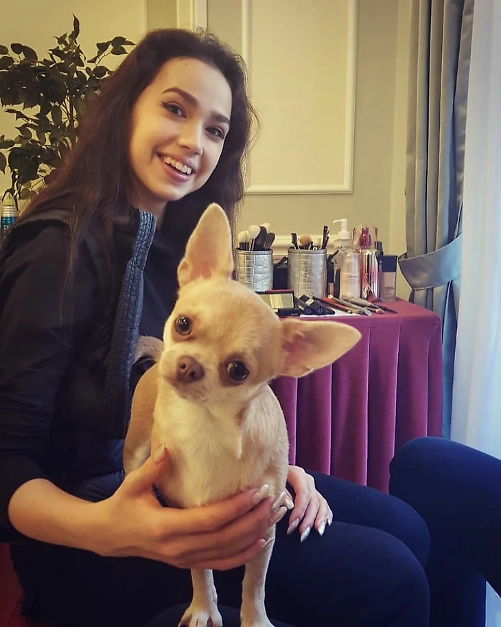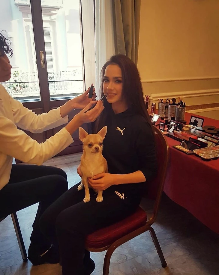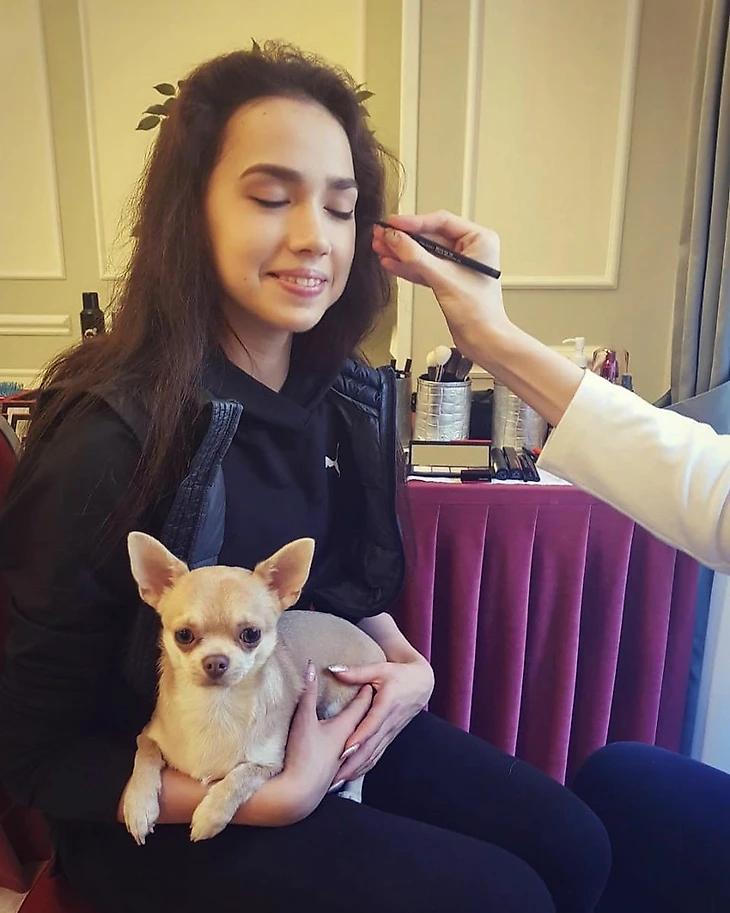 Так Алина готовилась к гала-выступлению в финале Гран-при (на котором в итоге не выступила) вместе с собачкой сестры Сабины и визажистами Shiseido в Турине.