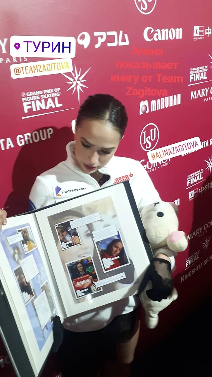 "Вот и закончился финал Гран-при. Не всё получилось в произвольной, но я рада быть в финале и соревноваться среди сильнейших в мире. Спасибо болельщикам за поддержку, я видела ваши плакаты "АLINA" и российские флаги - это невероятно - я слышала всех вас. Для меня ваша любовь - дороже золота. Вы ЛУЧШИЕ, вы самые замечательные, и вместе мы будем идти только вперёд. БОЛЬШОЕ СПАСИБО моим дорогим тренерам Этери Георгиевне Тутберидзе, Даниилу Марковичу Глейхенгаузу и Сергею Викторовичу Дудакову. Спасибо моей семье.Также спасибо моим @shiseido и @puma за постоянную поддержку, помощь и поздравления на протяжении всех этапов гран-при!"