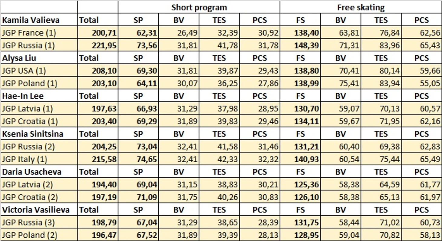 Обратим также внимание на большой разброс результатов по этапам у Камилы (21,2). Это говорит о том, что в финале могут быть как приятные (например, два чистых квада в ПП), так и неприятные сюрпризы с ее стороны (особенно в КП). Ксения, Даша, Хэ Ин и Вика очень стабильны в КП, отметим в целом очень хорошую стабильность результатов кореянки, Даши и Вики.