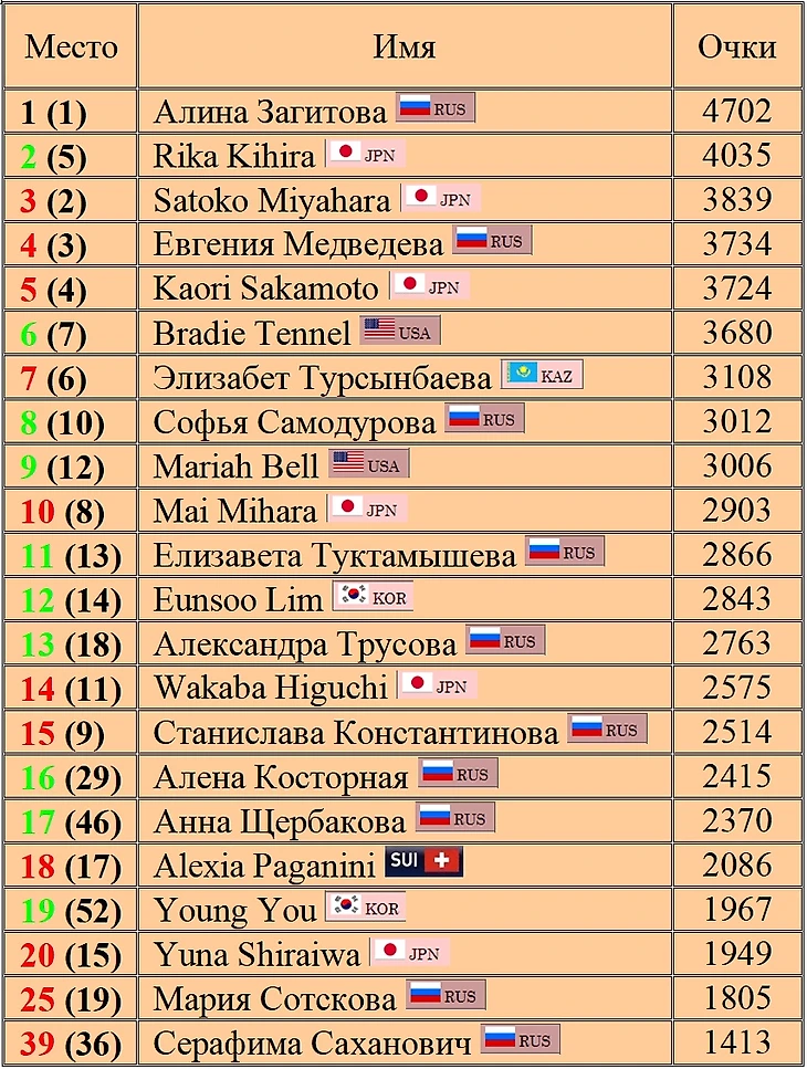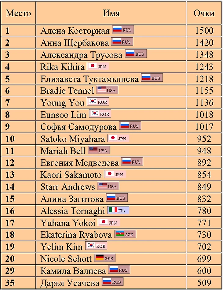 Рейтинг ISU женщин на текущий сезон 2019/2020