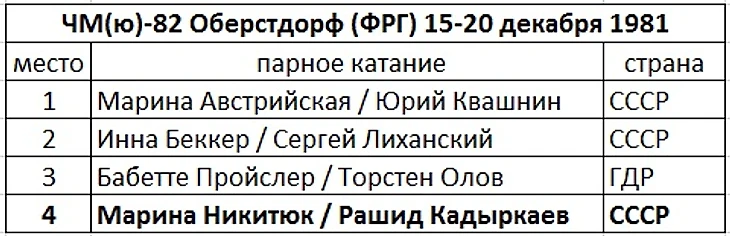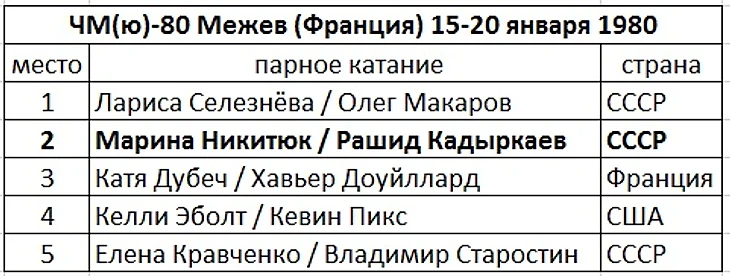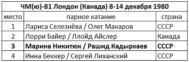 Наверное, самыми успешными ташкентскими фигуристами являются Марина Никитюк и Рашид Кадыркаев, выступавшие в парном катании. Они воспитанники супругов Валерия и Валентины Тюковых, позднее переехавших в Пермь (звание заслуженного тренера РСФСР Валерий Николаевич получит уже там). Главный успех Никитюк и Кадыркаева - серебряная медаль чемпионата мира среди юниоров 1980 года. Юниорами, по правилам ИСУ того времени, считались юноши и девушки на 1 июля, не достигшие возраста 19 лет (кроме мужчин, выступающих в парах и танцах на льду, их возрастной предел — 21 год).