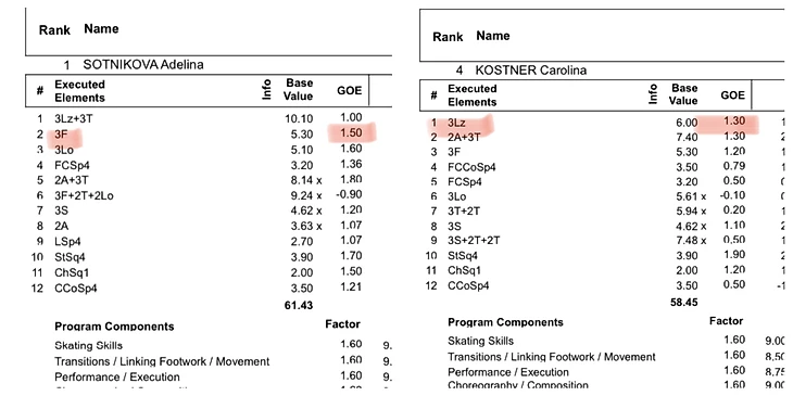 И за этот флип, как мы видим в протоколах выше, она получила 1.5 гое, а Ким 1.2 , на 0.3 меньше Аделины) Для совсем уж кристально объективной оценки произошедшего давайте сравним ещё с такой же как Ким технически школьно безупречной в прыжках фигуристкой, Каролиной Костнер. Ее лутц из произвольной программы Сочи