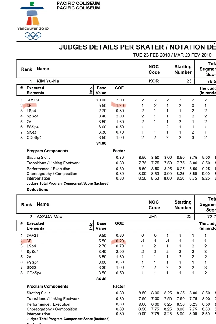 Как известно Юна Ким обладала почти совершенной техникой всех прыжков. У Мао Асада были грязные зубцовые, лутц и флип. Причём «грязные» на уровне примерно сопоставимом с вариантом «идеальной» Алёны Косторной в лучшем ее исполнении. Не ошибки как «бергеры» и близко, нет, просто грязь с «проседанием» и отрыв позже 1/4. Ее за это наказывали, и вообще оценивали так что ей невыгодно было в принципе мучиться и вставлять лутц в программу, в Ванкувере не было ни одного на две программы, флип у неё получался чуть лучше и он был.