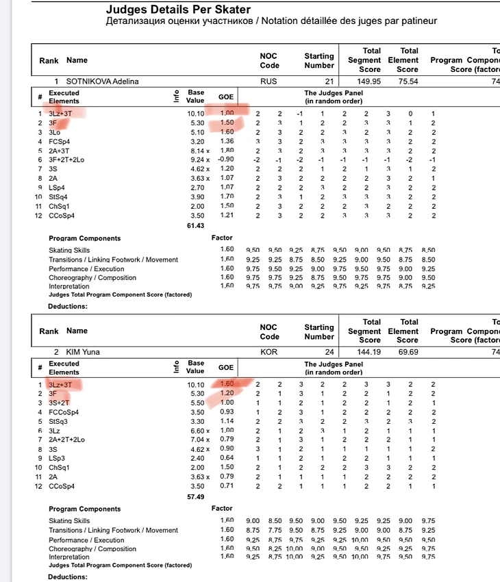 Уже ближе к привычному нам.. «судейству») Разница всего 0.6, неверного ребра у Аделины не стоит, какое там понижение или недокрут на тулупе, ничего нет. Вспоминаем что у Асада в Ванкувере с передним ребром на том флипе все было хорошо, отрыв был раньше 1/2 , заднее ребро не лежало, но разница в ГОЕ с Ким была целый балл только за толчок грязным зубцом. При этом в 2014 Сотникова была ещё никто, а Асада в 2010 уже чемпионка мира.