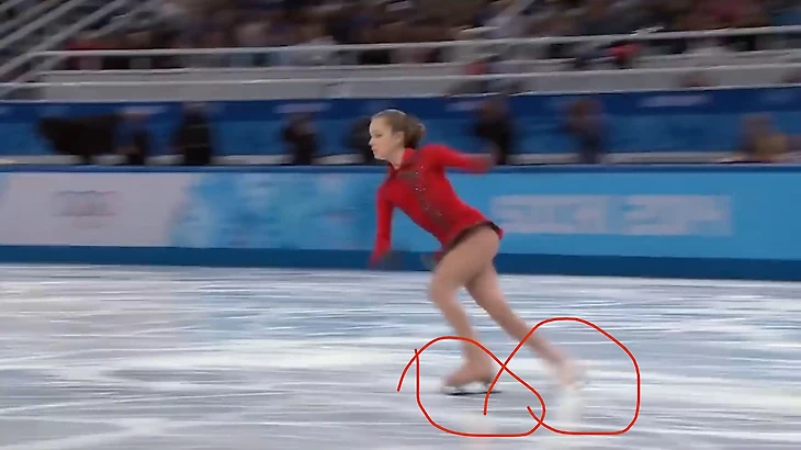 Морфеус обычно утверждает что у Ани стабильный «флутцбергер» - я предлагаю истолковать «флутц/лутц» в данном случае в пользу спортсменки, ибо ракурс не позволяет судить насколько переднее ребро внутреннее или нет . Визуально кажется таким, но без ракурса в фас или сзади, может она в последний момент его поменяла на еле внешнее, это дискуссионно. Так что о положении переднего ребра говорить не будем, только о заднем и толчке.