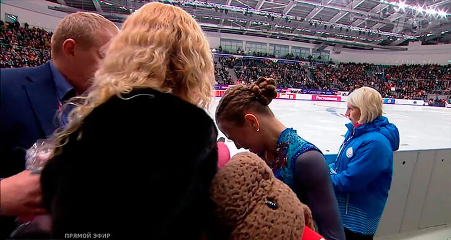 На льду Саша сдержала эмоции, но едва попала в объятия Тутберидзе и Глейхенгауза у бортика – разрыдалась.