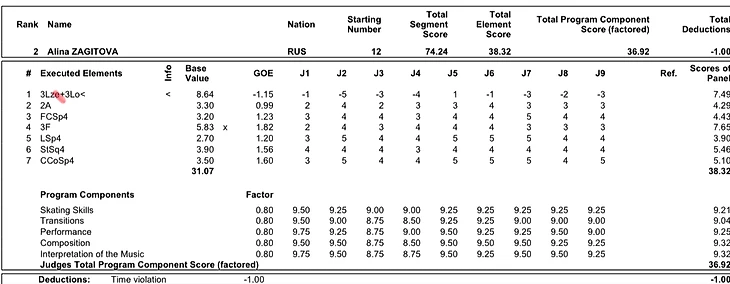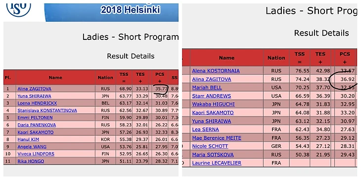 Компоненты короткой (36.92) Загитова получила больше всех в сезоне. В произвольной (72.97) проиграла только Медведевой 0.8 балла , но у Алины было падение , а Женя катала чисто. Если б Алина не упала, ее компоненты были бы выше больше чем разница 0.8
