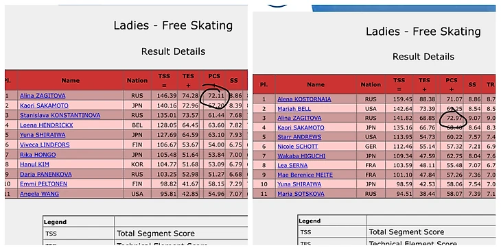Кажется, ну чему после этого можно удивиться. А вот нет, я же обещала чудеса в протоколах 🙃 Думаю, удивит чудесная разница в компонентах Жени относительно ее же самой. Дело в том что Женя, как собственно в этом году и ТЩК, до первого взрослого гран-при принимала участие в более мелком старте.