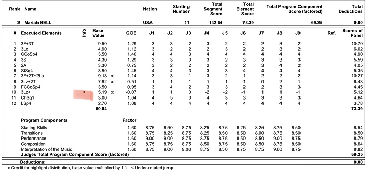 В Гренобле же напротив Алине простили это понижение на риттбергере и оставили просто недокрут. Чтобы до конца оценить степень судейской лояльности, давайте посмотрим в сравнении как судили в том же Гренобле ближайшую конкурентку, американку Мэрайю Белл