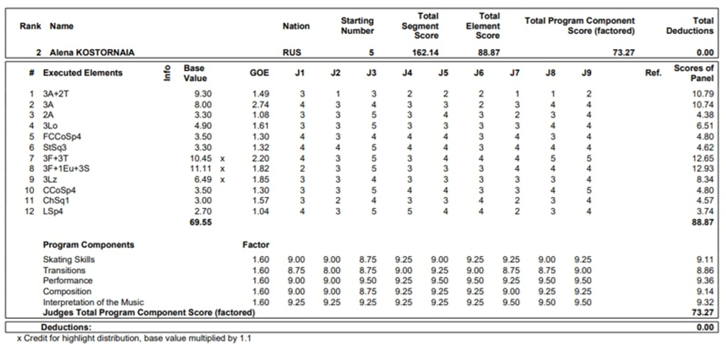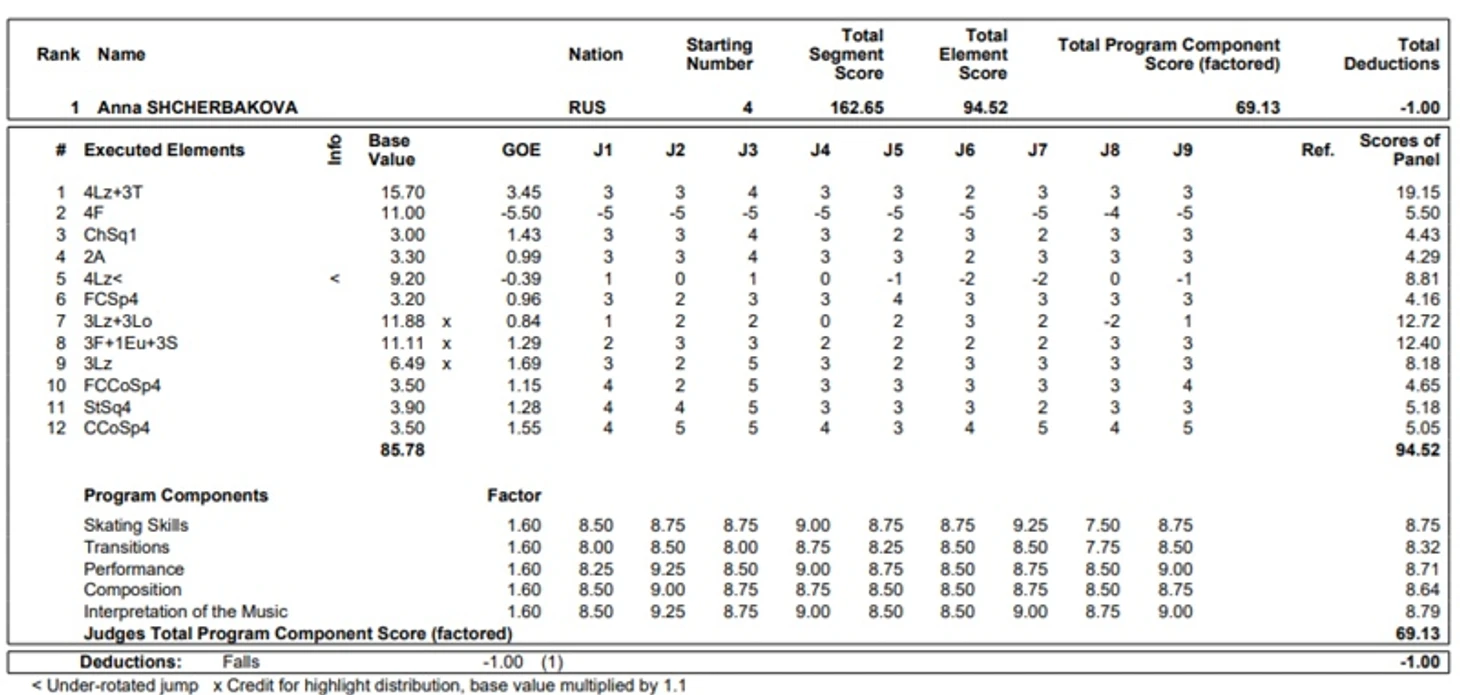 Посмотрим результаты финала Гран-При. Чистая короткая Ани получила хорошие оценки - 78,27. В произвольной Аня набрала огромные 162,65, несмотря на две очень дорогие ошибки. Недокрут на сольном лутце лишил её около 6 баллов, за чистый четверной флип можно было набрать около 14, а не 4,5. Плюс небольшие потери на 3Л-3Р. Таким образом, идеальный Анин прокат произвольной дал бы приблизительно 179 баллов, а сумма стала бы равна 257.