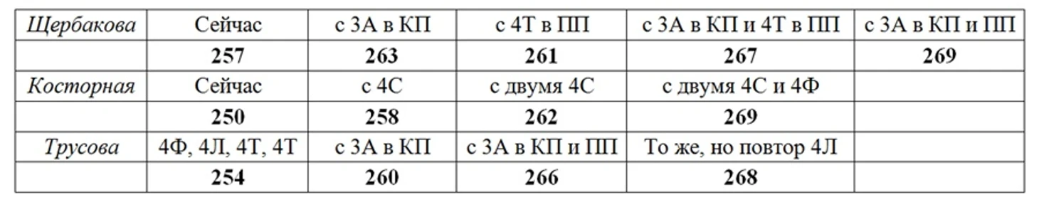 Но именно 3А наиболее усилит Щербакову, так как позволит выкинуть самые дешёвые её элементы - дупели.  С одной замены  условно считаем +6. Поэтому набор "Мечта щербабота" оценивается в 257+12 =269 баллов. Как с этим вообще бороться?! Но стоит только освоить 3А, и можно смело идти на 3А в КП, не меняя ПП. Это позволит обойти вышеописанные проблемы 2 и 3. Сумма будет 257+6=263 балла.