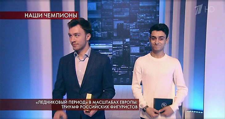 В студию зашли шесть призеров Евро в парах – места на диванах не хватило, и Денис Ходыкин сел на пол, скрестив ноги.
