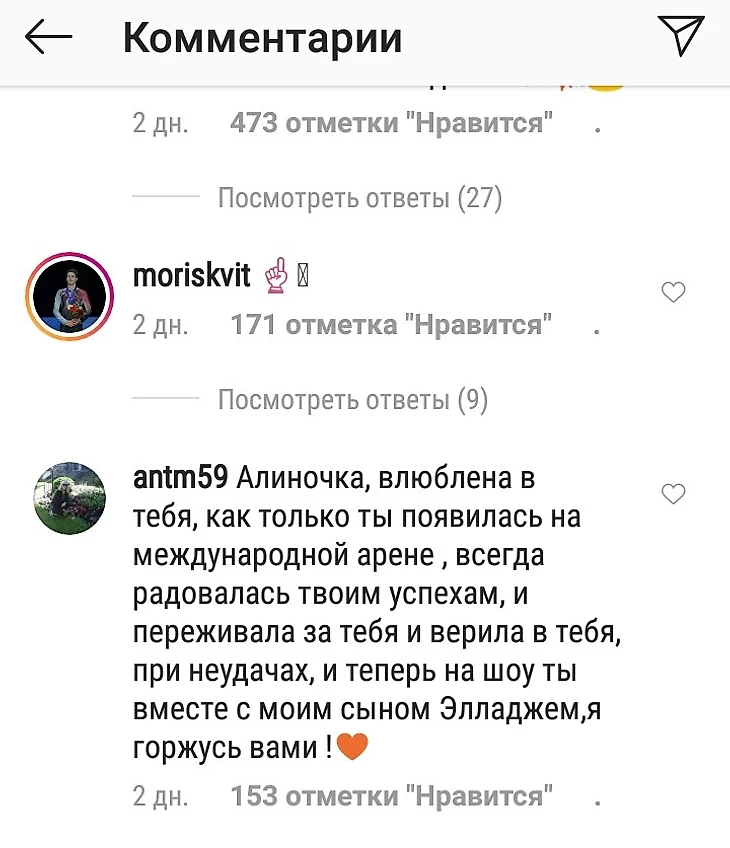 "Алиночка, влюблена в тебя, как только ты появилась на международной арене, всегда радовалась твоим успехам, и переживала за тебя и верила в тебя, при неудачах, и теперь на шоу ты вместе с моим сыном Элладжем, я горжусь вами !♥"