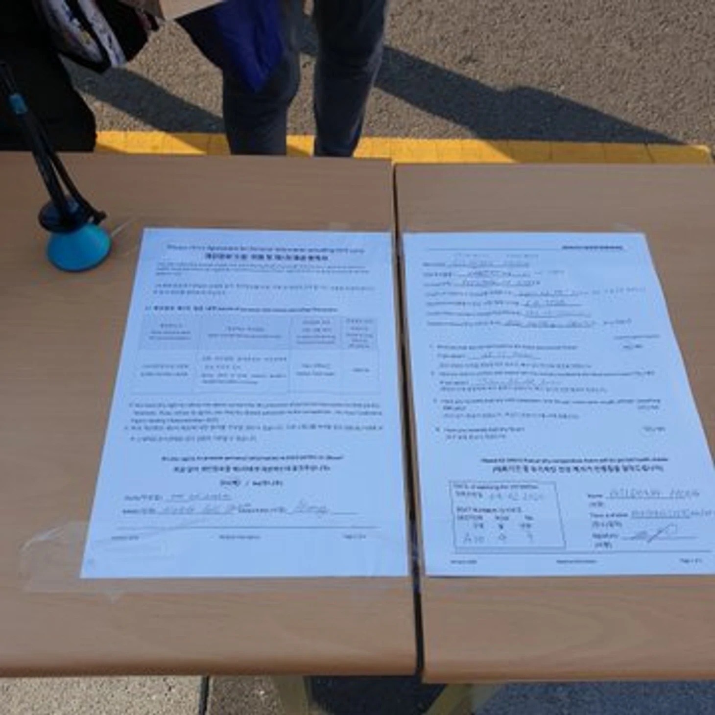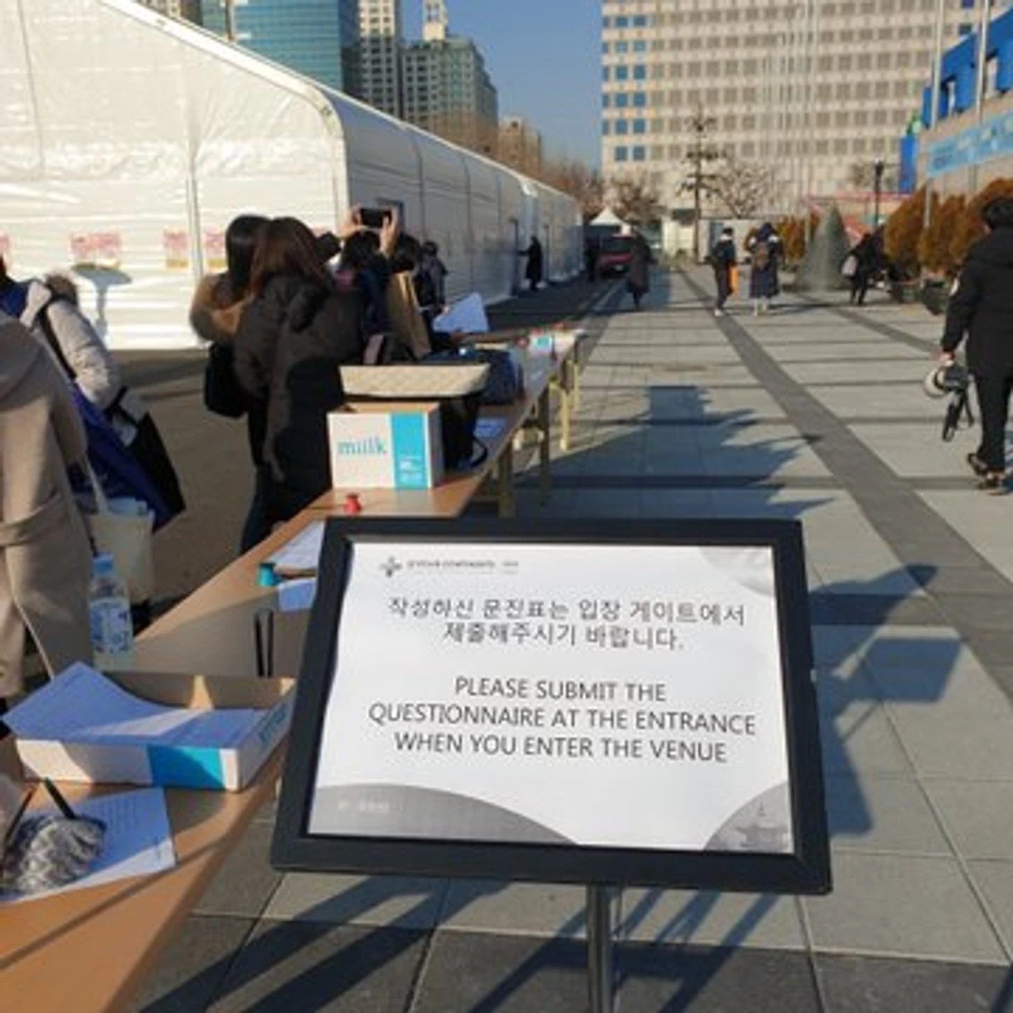 Например, надо было при первом посещении заполнить форму о здоровье-посещали ли вы Ухань, болели ли вы в посл время и т. д. и т. п. Столы с формами находились перед зданием катка и на втором этаже у общего входа на каток. В четверг добавились пояснения как заполнять форму на японском языке, но все равно бедные японки очень мучались, т. к. сама форма была на корейском и английском.