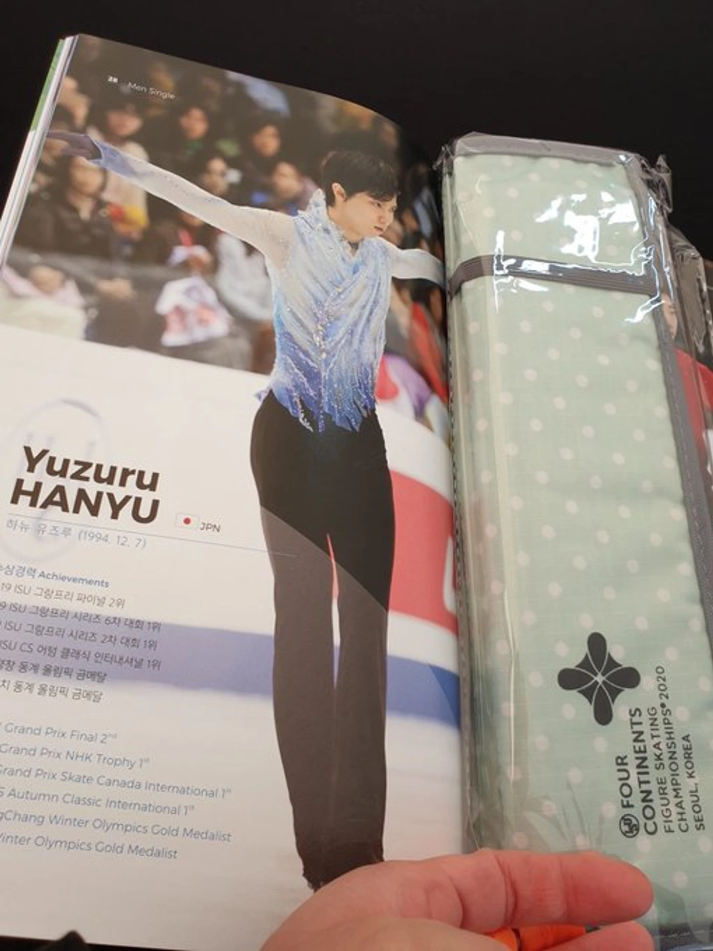 При покупке билета на все дни соревнования вам полагался подарок: книга с фото фигуристов, в основном корейских, складывающаюся подстилка на сидение (и она очень пригодилась, так как сидения на катке пластиковые и холодные) и авоська-я видела трех цветов-оранжевого, фиолетового и серого.