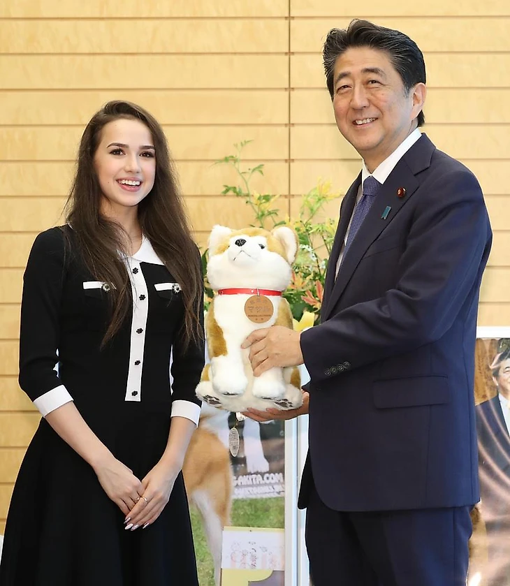 На этой фотографии вы можете видеть ту самую плюшевую игрушку "Масару", о которой и говорилось в первых абзацах статьи(прим. Алина Загитова "сама" вручила ее премьер министру Японии).