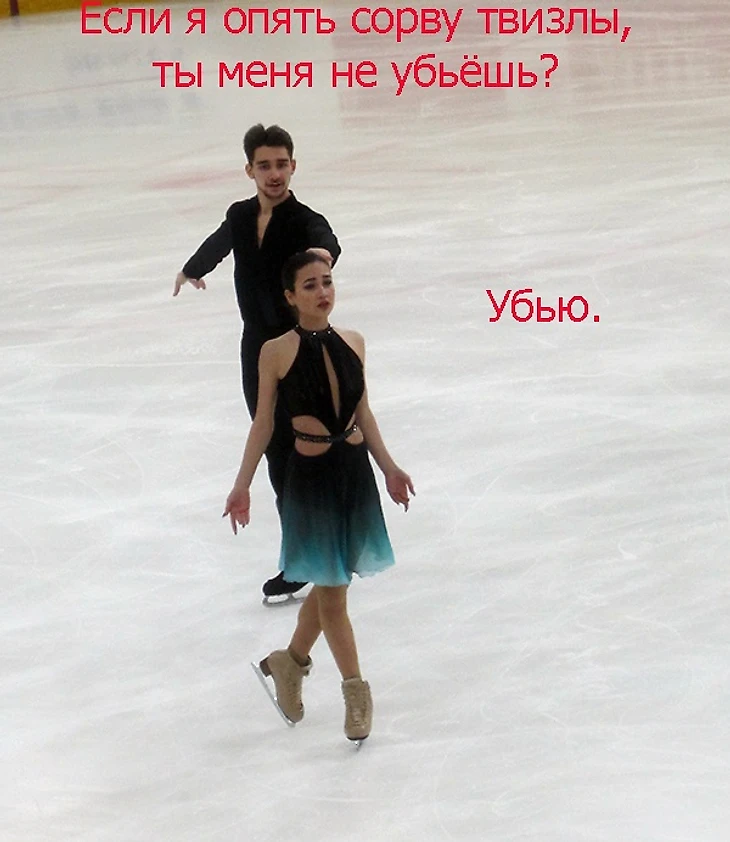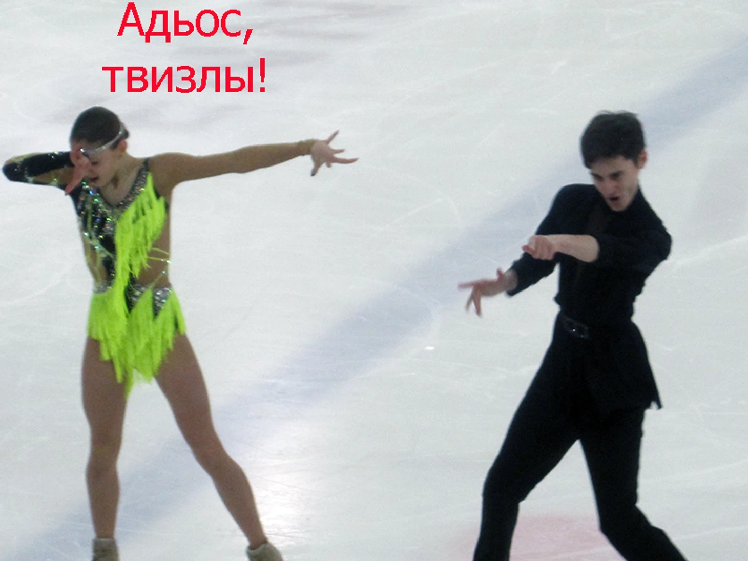В ПП решили не сбавлять оборотов и вдарили саундтреком к фильму «Богемская рапсодия». Партнёрша выглядела упитанной девушкой, чуть не навернулась на твизлах.