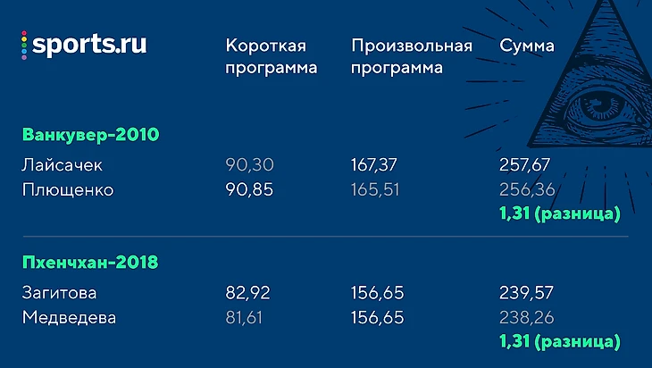 Ровно столько разделили Эвана Лайсачека и Евгения Плющенко на Олимпиаде-2010 в Ванкувере. Не поверите, но столько же выиграла Алина Загитова у Евгении Медведевой на Играх-2018 в Пхенчхане.
