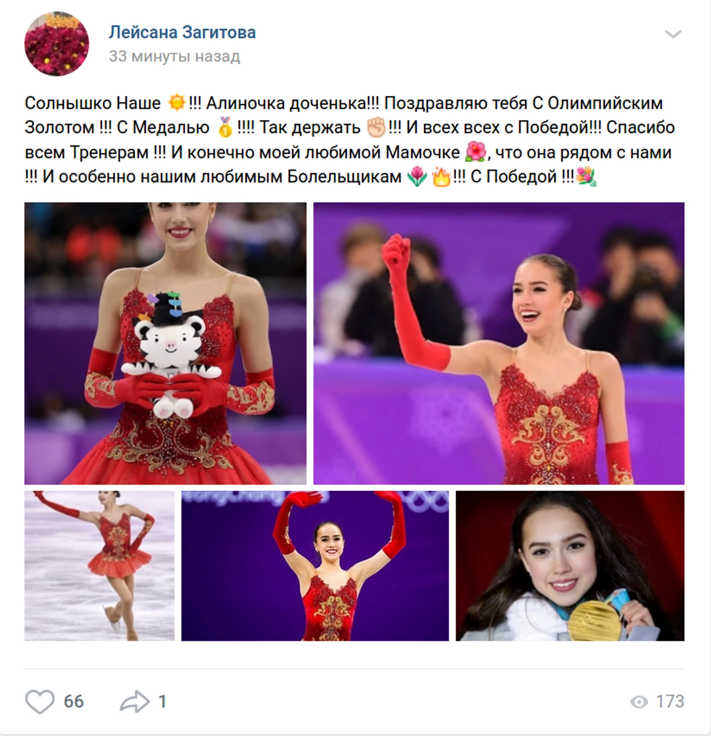 «23 февраля! Хочу поздравить всех с Днём защитника Отечества, и для меня эта дата всегда будет дорогой и памятной. Именно в этот день 2 года назад мне и моим тренерам Этери Георгиевне Тутберидзе, Даниилу Марковичу Глейхенгаузу и Сергею Викторовичу Дудакову удалось завоевать Золотую медаль на Олимпийских играх. Спасибо моей семье и болельщикам, что были рядом и болели за нас. Только спустя время начинаешь осознавать радость, счастье и гордость за то, что нам удалось защитить честь своей страны. С Праздником!»