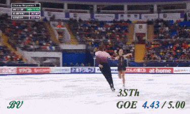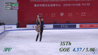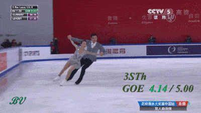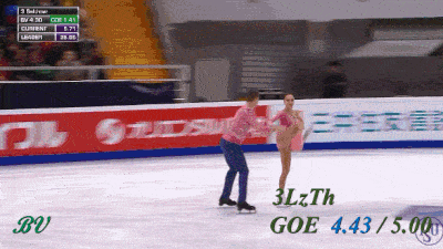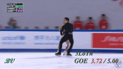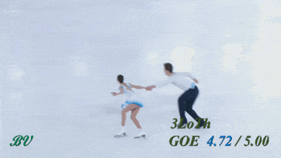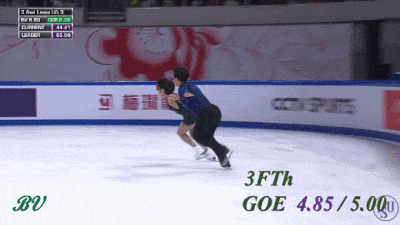 Не сказал бы, что выезд получился прямо идеальным - явно был небольшой клюв на приземлении. Да и пауза перед выбросом уж больно великовата по сравнению с предыдущими номинантами. Скажем так, конечно дело вновь происходит в родном Китае, все объяснимо, но по сравнению с их же тройным сальховом (с этого же проката) смотрится, я бы сказал, менее эффектно. Разве что, высота чуть больше. Может это стало ключевым моментом. Надбавки еще зависят от того, как далеко от панели и под каким углом обзора делается выброс. Тем не менее, здесь GOE +5 в итоге были выставлены всеми судьями кроме двоих, а в первый момент на табло вообще горела максимальная надбавка. Это лучший элемент выпуска.