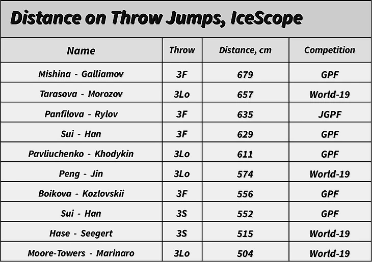 Выброс 3Lo куда более популярен у топовых пар, его исполняет подавляющее большинство. В среднем, самая большая высота набирается именно на нем. Интересно, что для обычных прыжков закономерность другая - там самым высоким обычно является лутц.