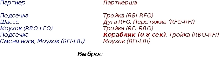 кораблик (партнер - наружний, партнерша - внутренний, 2.7 сек) - тройка партнерши (RFO-RBI) - провозка - выброс