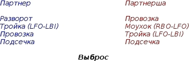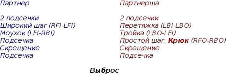 моухок партнерши (LBI-RFI) - подсечка партнера - дуга (зеркально LBI -- RFI) - широкий шаг партнерши (RFI-LFI) - моухок партнерши (LFI-RBI) - подготовка - выброс