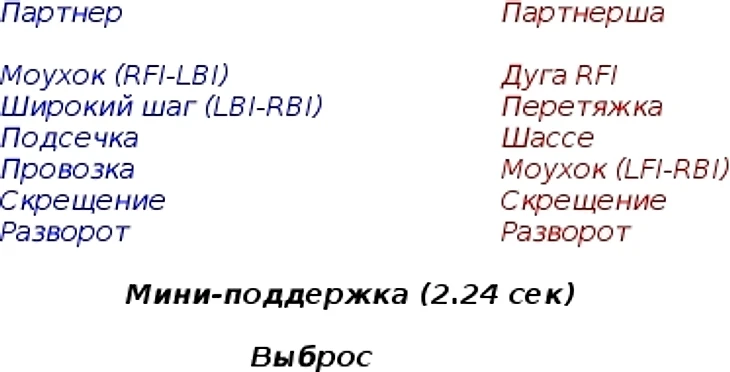 перепрыжка партнера - арабеск партнерши (0.83 сек) - моухок партнерши (LBO-RFO) - смена ноги партнерши - мини-поддержка (0.5 об.) - выброс