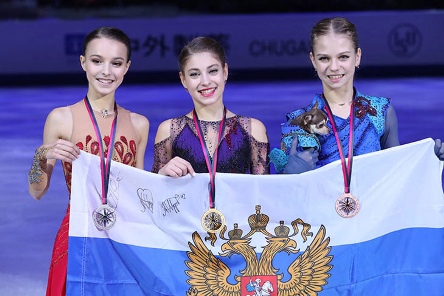 Женщины: Алена Косторная, Анна Щербакова, Александра Трусова.